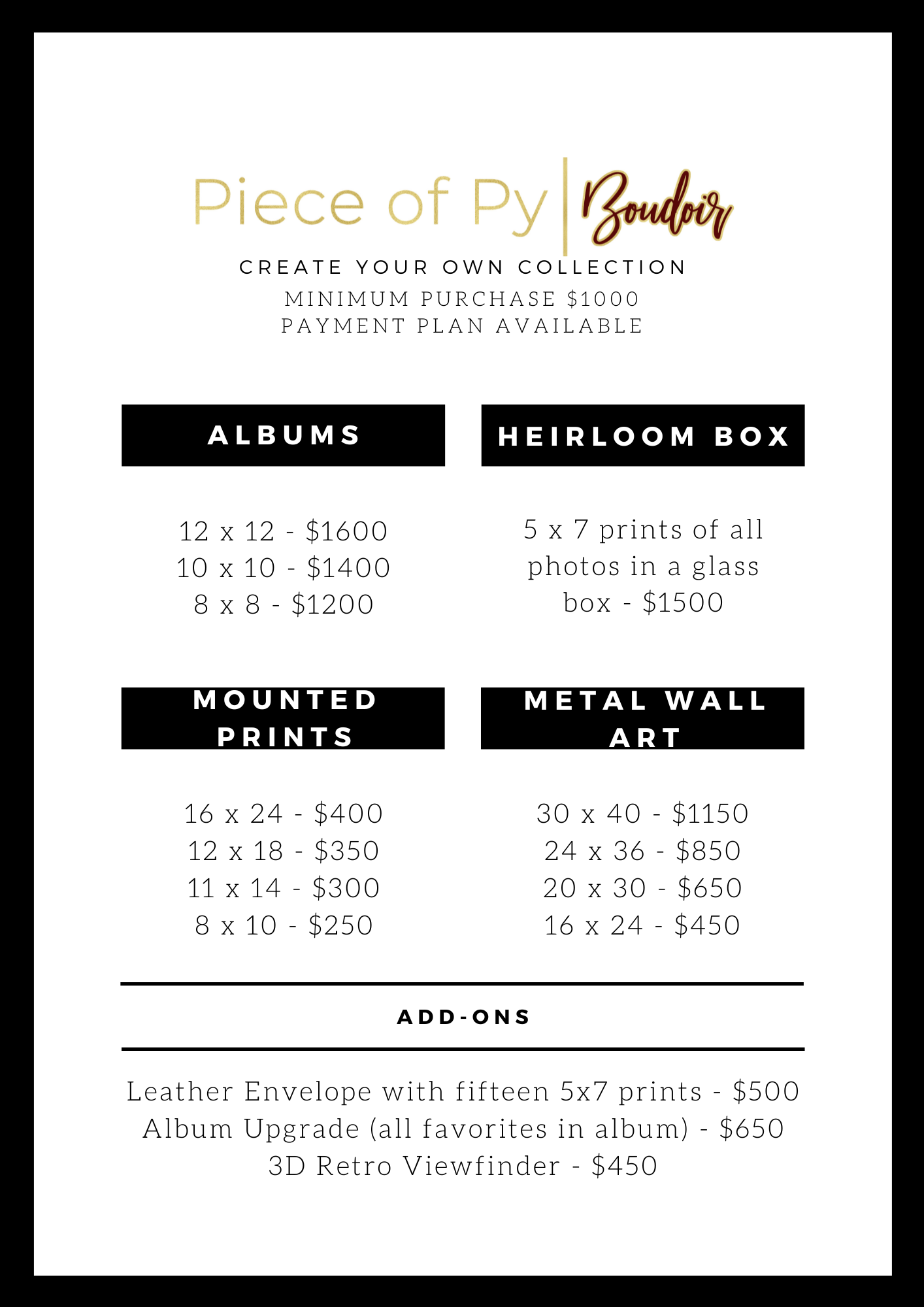 Or would you rather build your own custom package? Do your thing, babe. You can mix and match albums, wall art, and prints to create something that’s 100% YOU. Because luxury should still be accessible.